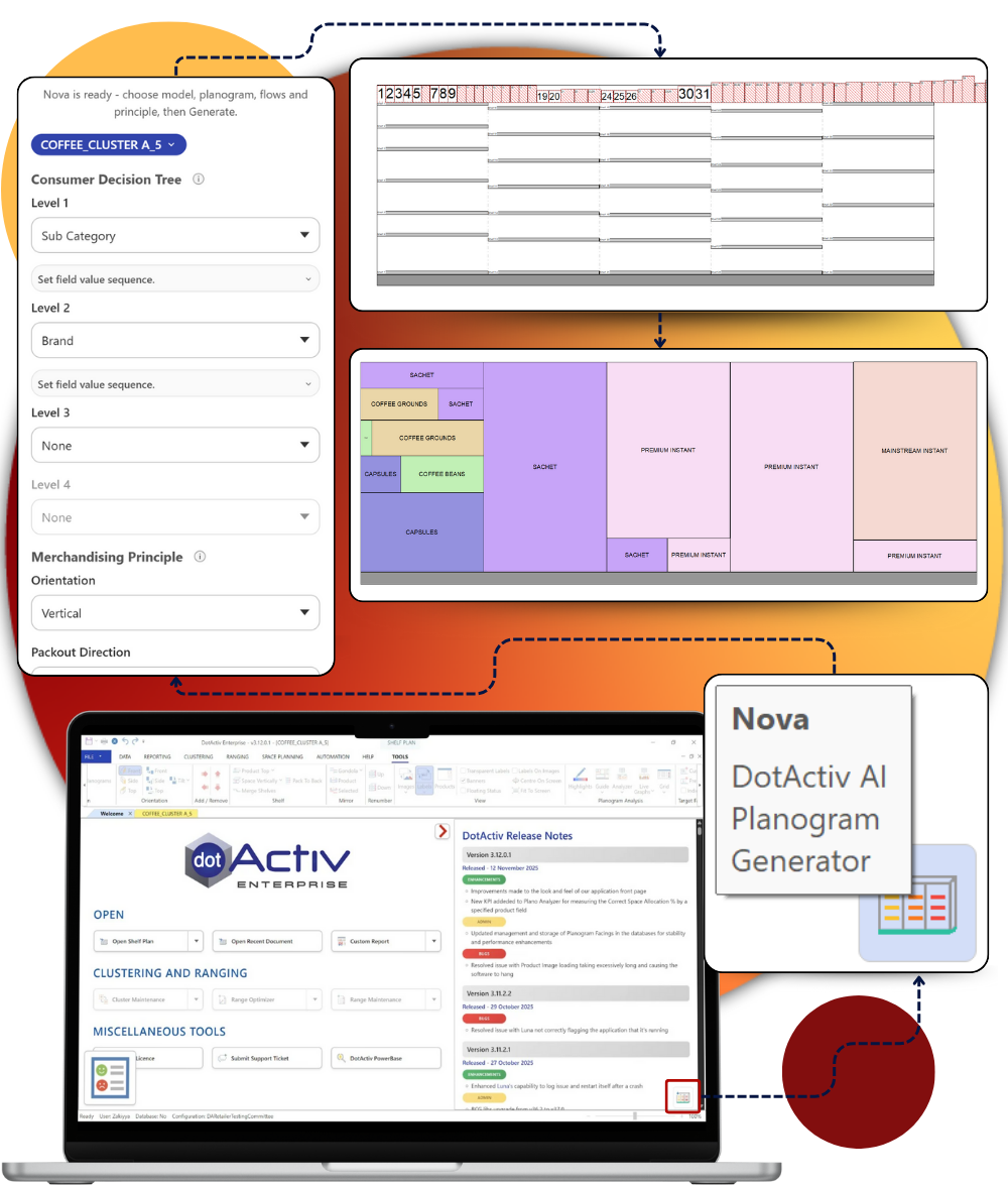 - Nova uses AI to generate planograms from the ground up. Built on zero-base logic, it creates intelligent shelf layouts based on shopper decision trees, your merchandising rules, and store format needs. Nova supports multiple AI models and can generate planograms for multiple store sizes in one step, helping teams move faster without sacrificing control.